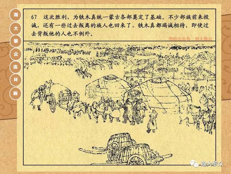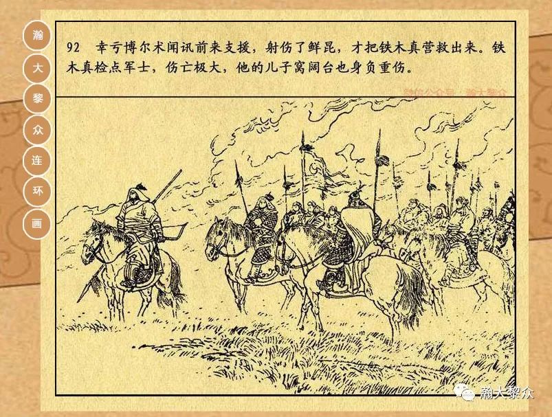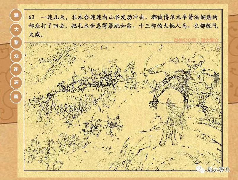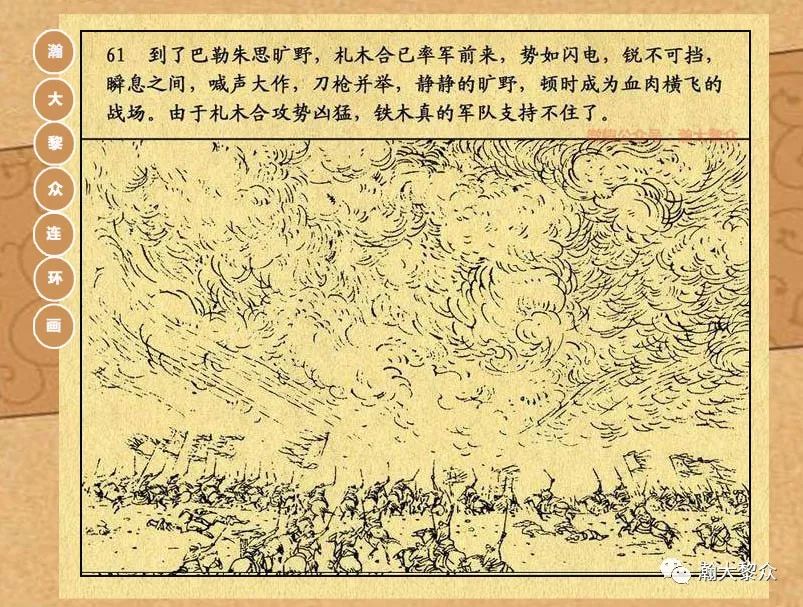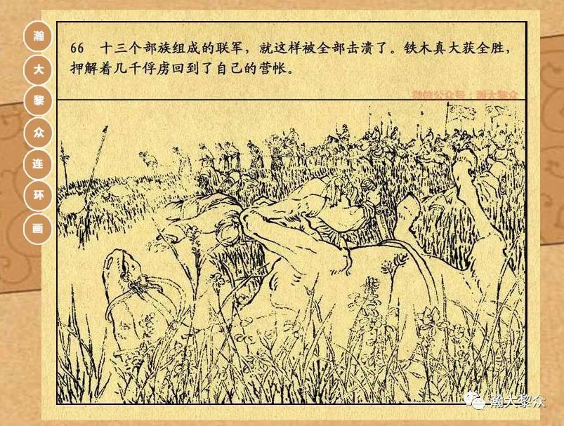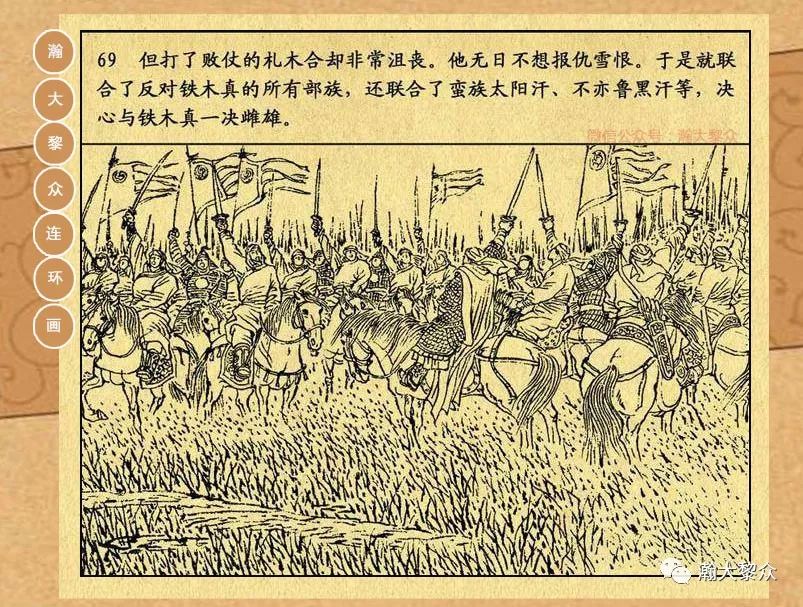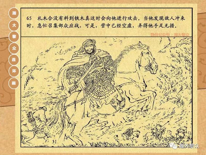 65札木合没有料到铁木真这时会向他进行攻击。当他发现敌人冲来时,急忙召集部众应战,可是,营中已经空虚,弄得他手足无措。