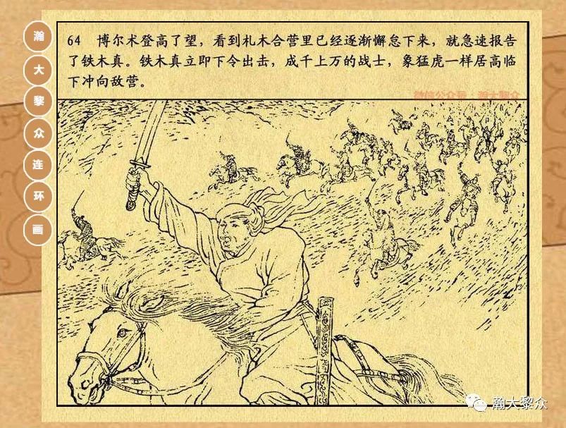 64博尔术登高了望,看到礼木合管里已经逐渐懈息下来,就急速报告了铁木真。铁木真立即下令出击,成千上万的战士,象猛虎一样居高临下冲向敌营。
