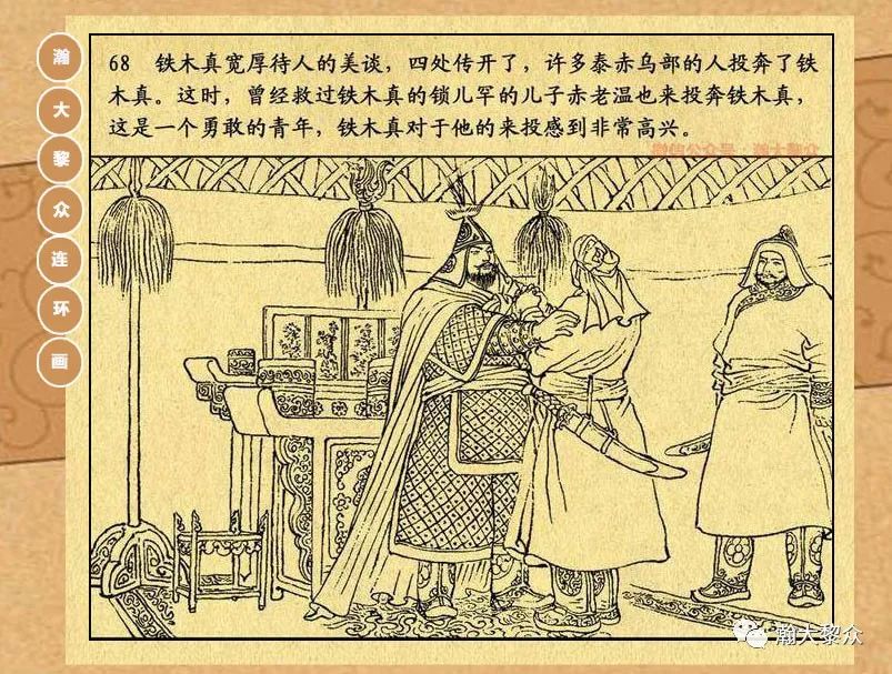 68铁木真宽厚待人的美谈,四处传开了,许多泰赤乌部的人投奔了铁木真。这时,曾经救过铁木真的锁儿罕的儿子赤老温也来投奔铁木真,这是一个勇敢的青年,铁木真对于他的来投感到非常高兴。