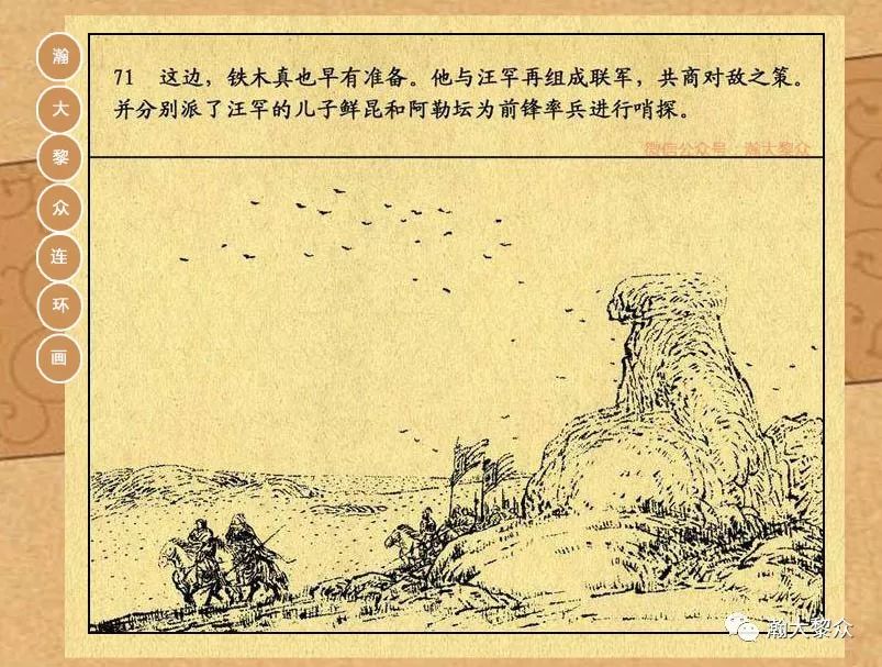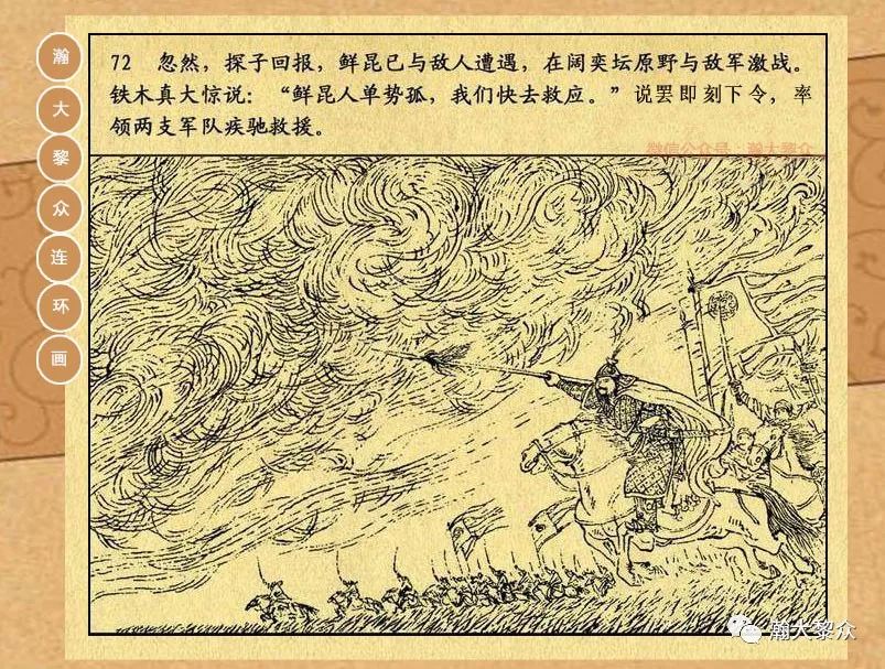 72忽然,探子回报,鲜昆已与敌人遭遇,在阔奕坛原野与敌军激战铁木真大惊说:“鲜昆人单势孤,我们快去救应。”说罢即刻下令,率领两支军队疾驰救援。