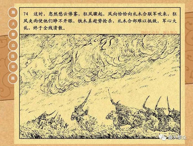 74这时,忽然愁云惨雾,狂风骤起,风向恰恰向札木合联军吹来,狂风夹雨使他们睁不开眼,铁木真趁势抢杀,札木合部难以抵敌,军心大乱,终于全线溃散。