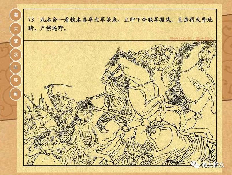 73札木合一看铁木真率军杀来,立即下令联军接战。直杀得天昏地暗,尸横遍野。