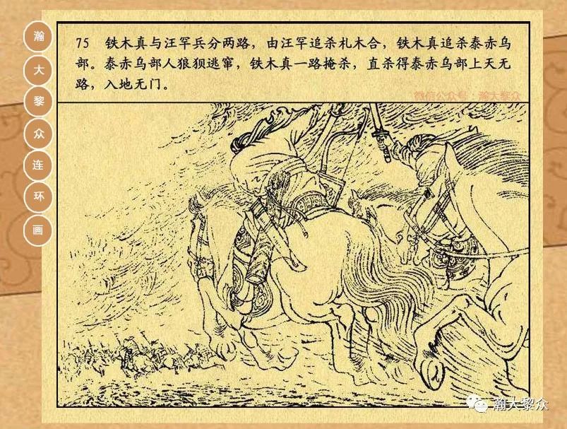 75铁木真与汪罕兵分两路,由汪罕追杀札木合,铁木真追杀泰赤乌部。泰赤乌部人狼狈逃窜,铁木真一路掩杀,直杀得泰赤乌部上天无路,入地无门。