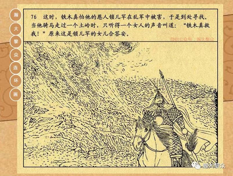 76这时,铁木真怕他的恩人锁儿罕在乱军中被害,于是到处寻找。当他骑马走过一个土岭时,只听得一个女人的声音叫道:“铁木真救我!”原来这是锁儿罕的女儿合答安。