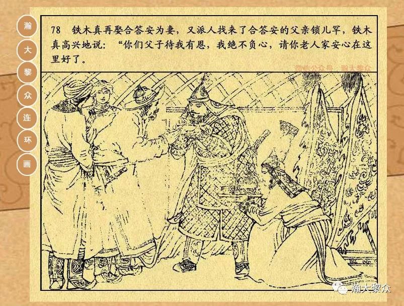 78铁木真再娶合答安为妻,又派人找来了合答安的父亲锁儿罕,铁木真高兴地说:“你们父子待我有恩,我绝不负心,请你老人家安心在这里好了。