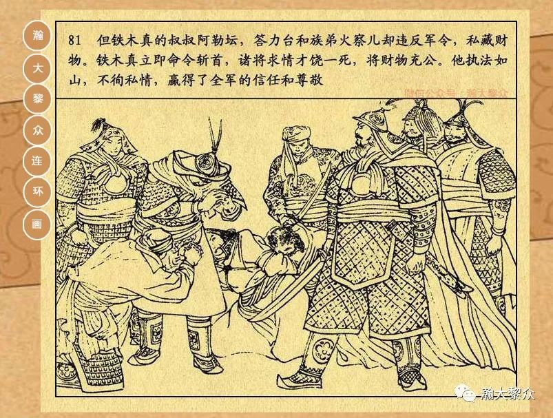 81但铁木真的叔叔阿勒坛,答力台和族弟火察儿却违反军令,私藏财物。铁木真立即命令斩首,诸将求情才饶一死,将财物充公。他执法如山,不徇私情,贏得了全军的信任和尊敬。