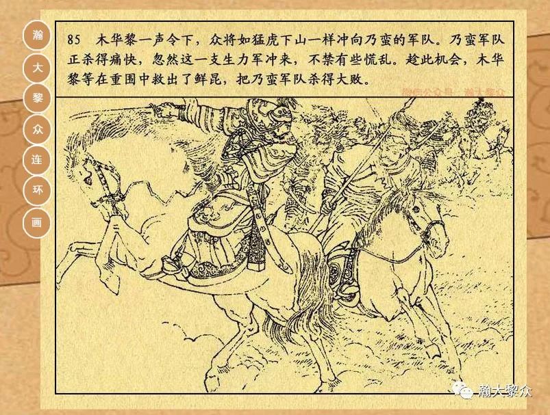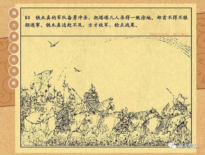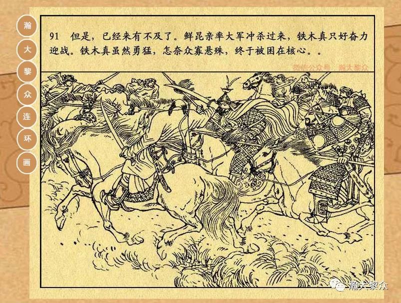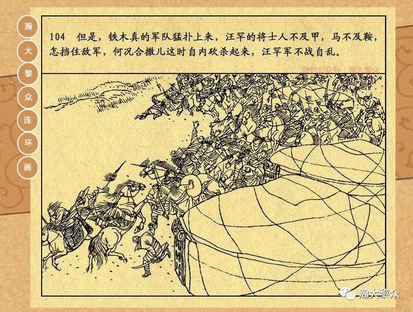 85木华黎一声令下,众将如猛虎下山一样冲向乃蛮的军队。乃蛮军队正杀得痛快,忽然这一支生力军冲来,不禁有些慌乱。趁此机会,木华黎等在重围中救出了鲜昆,把乃蛮军队杀得败。