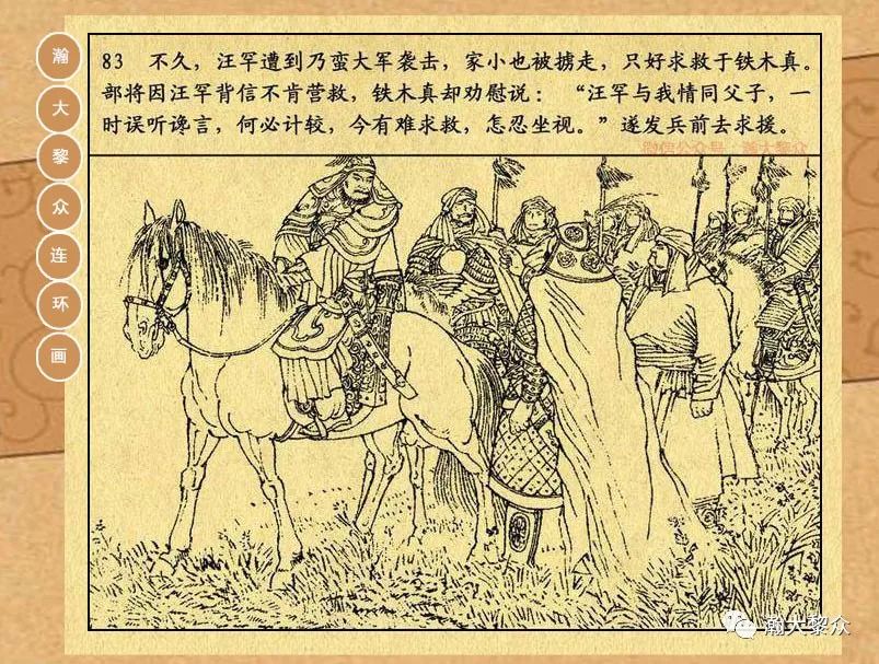 83不久,汪罕遭到乃蛮军袭击,家小也被掳走,只好求救于铁木真。部将因汪罕背信不肯营救,铁木真却劝慰说:“汪罕与我情同父子,一时误听谗言,何必计较,今有难求救,怎忍坐视。”遂发兵前去求援。