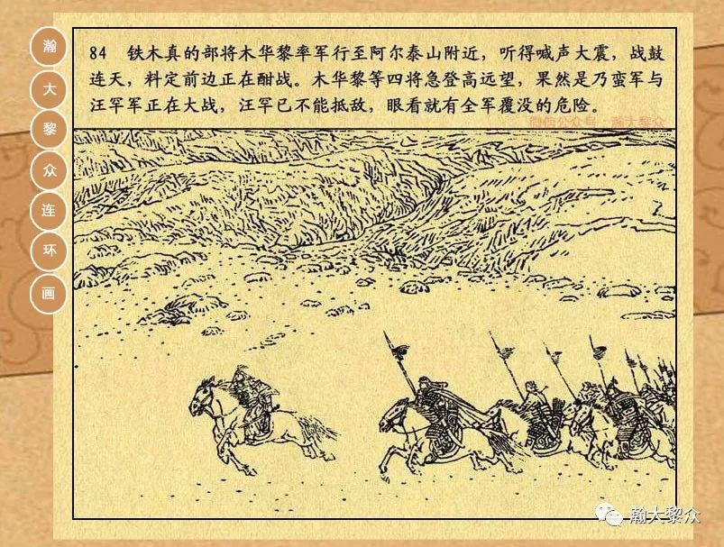 84铁木真的部将木华黎率军行至阿尔泰山附近,听得喊声震,战鼓连天,料定前边正在酣战。木华黎等四将急登高远望,果然是乃蛮军与汪罕军正在大战,汪罕已不能抵敌,眼看就有全军覆没的危险。