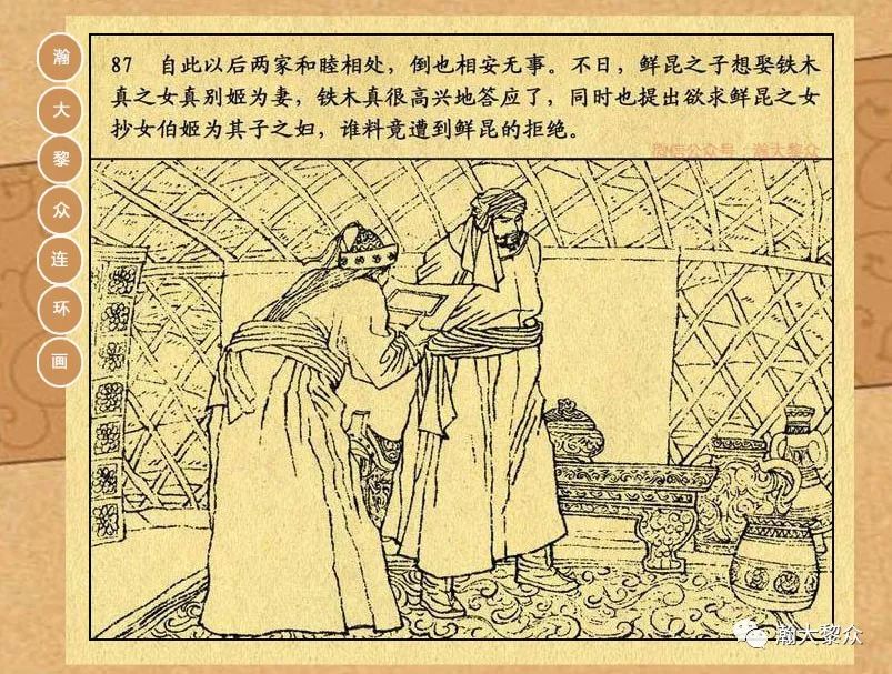 87自此以后两家和睦相处,倒也相安无事。不日,鲜昆之子想娶铁木真之女真别姬为妻,铁木真很高兴地答应了,同时也提出欲求鲜昆之女抄女伯姬为其子之妇,谁料竟遭到鲜昆的拒绝。