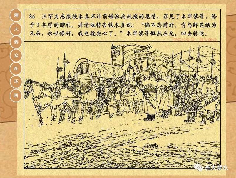 86汪罕为感激铁木真不计前嫌派兵救援的恩情,召见了木华黎等,给予了丰厚的赠礼,并请他转告铁木真说:“倘不忘前好,肯与鲜昆结为兄弟,永世修好,我也就安心了。”木华黎等慨然应允,回去转达。