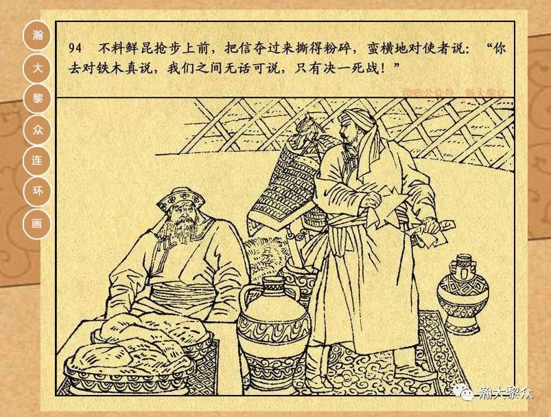 94不料鲜昆抢步上前,把信夺过来撕得粉碎,蛮横地对使者说:“你去对铁木真说,我们之间无话可说,只有决一死战!”
