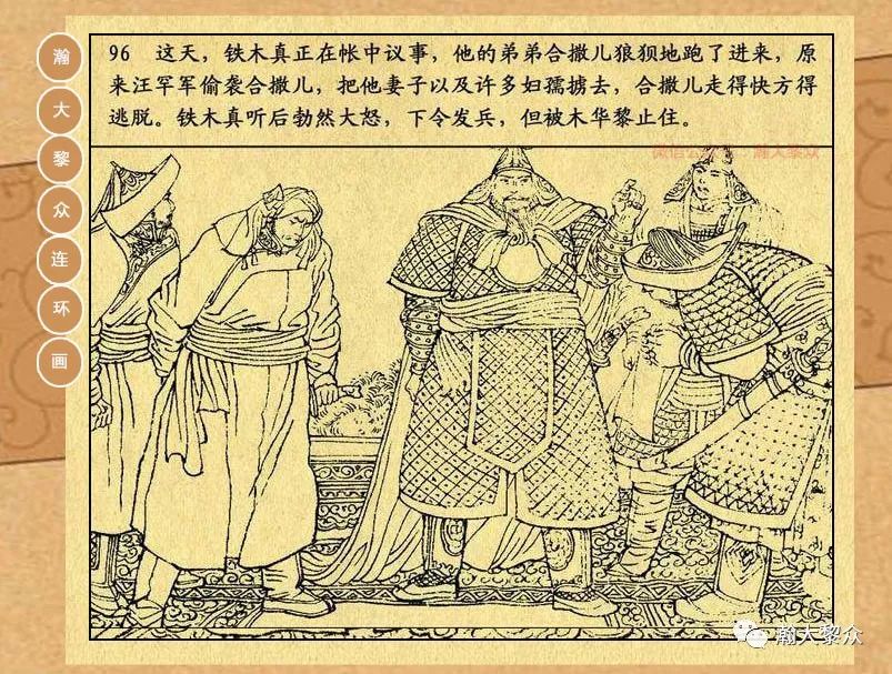 96这天,铁木真正在帐中议事,他的弟弟合撒儿狼狈地跑了进来,原来汪罕军偷袭合撒儿,把他妻子以及许多妇孺掳去,合撒儿走得快方得逃脱。铁木真听后勃然怒,下令发兵,但被木华黎止住。