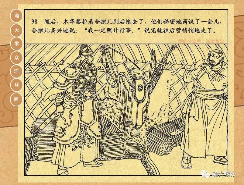 98随后,木华黎拉着合撒儿到后帐去了,他们秘密地商议了一会儿,合撒儿高兴地说:“我一定照计行事。”说完就往后营悄悄地走了。