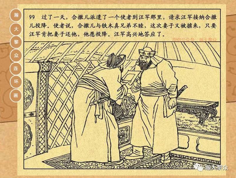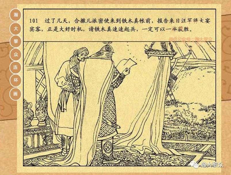101过了几天,合撒儿派密使来到铁木真帐前,报告来日汪罕将宴宾客,正是好时机,请铁木真速速起兵,一定可以一举获胜。