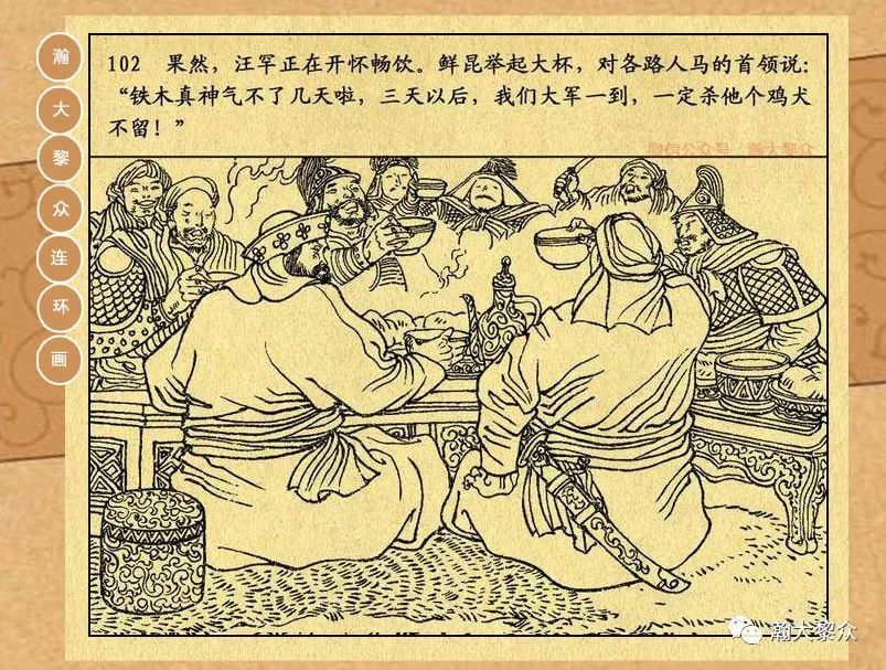 102果然,汪罕正在开怀畅饮。鲜昆举起杯,对各路人马的首领说:“铁木真神气不了几天啦,三天以后,我们军一到,一定杀他个鸡犬不留!
