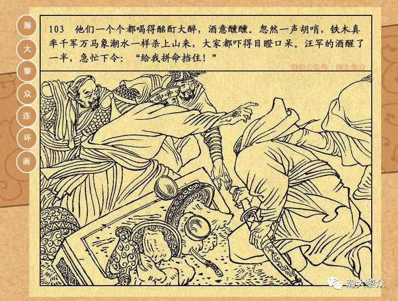 103他们一个个都喝得酩酊醉,酒意醺醺。忽然一声胡哨,铁木真率千军万马象潮水一样杀上山来,家都吓得目瞪口呆。汪罕的酒醒了一半,急忙下令:“给我拼命挡住!”
