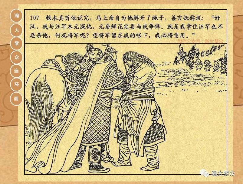 107铁木真听他说完,马上亲自为他解开了绳子,善言抚慰说:“好汉,我与汪罕本无深仇,无奈鲜昆定要与我争锋。就是我拿住汪罕也不忍杀他,何况将军呢?望将军留在我的帐下,我必将重用。”