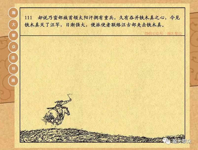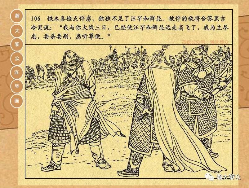 106铁木真检点俘虏,独独不见了汪罕和鲜昆。被俘的敌将合答黑吉冷笑说:“我与你战三日,已经使汪罕和鲜昆远走高飞了,我为主尽忠,要杀要剐,悉听尊便。”