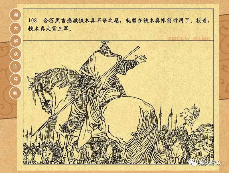 108合答黑吉感激铁木真不杀之恩,就留在铁木真帐前听用了。接着,铁木真赏三军。