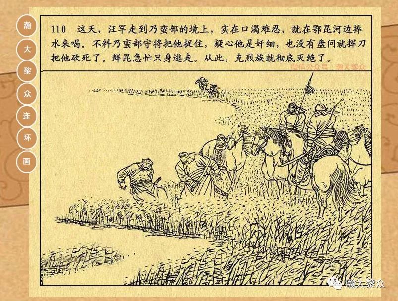 110这天,汪罕走到乃蛮部的境上,实在口渴难忍,就在鄂昆河边捧水来喝。不料乃蛮部守将把他捉住,疑心他是奸细,也没有盘问就挥刀把他砍死了。鲜昆急忙只身逃走。从此,克烈族就彻底灭绝了。