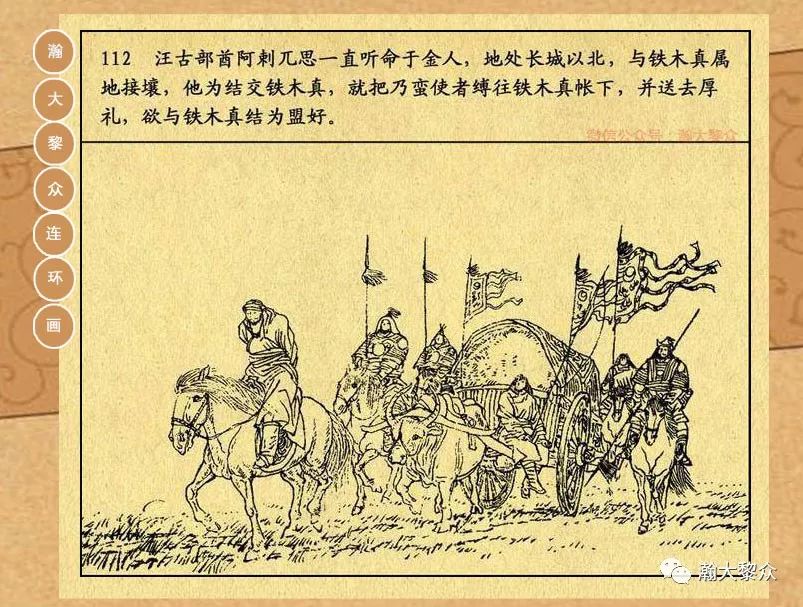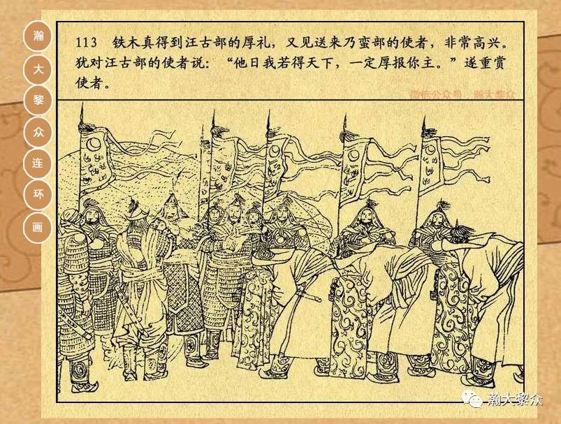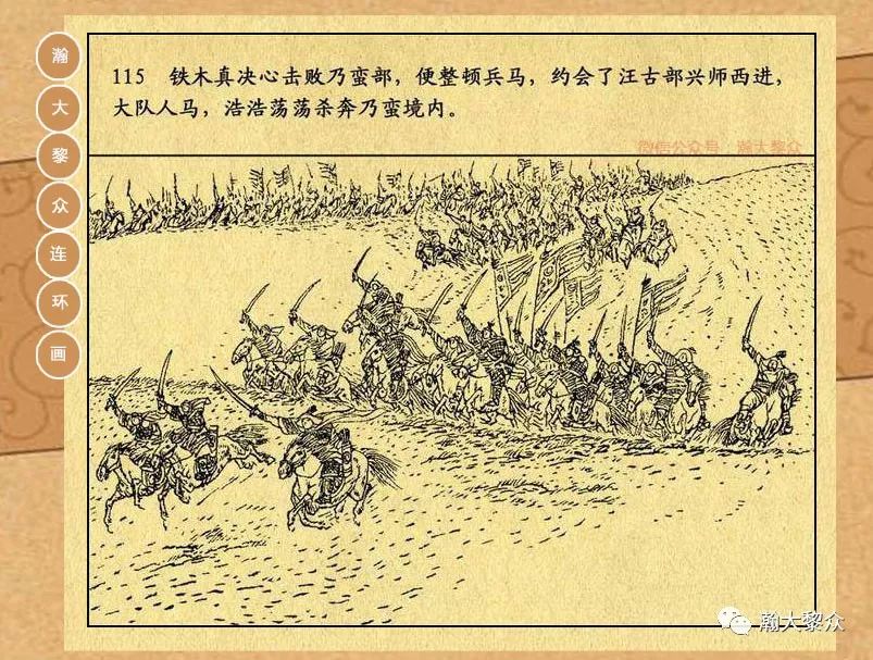 114铁木真召集众将,打算西攻乃蛮。但有人惧怕乃蛮部强,不敢出兵。铁木真的弟弟铁木格力主出兵,他说:“乃蛮自恃强,妄想夺我土地,不如攻其不备,定可打败他。