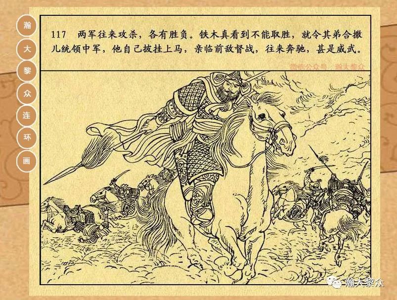 117两军往来攻杀,各有胜负。铁木真看到不能取胜,就令其弟合撒儿统领中军,他自己披挂上马,亲临前敌督战,往来奔驰,甚是威武。
