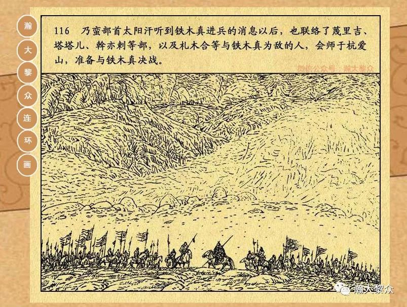 116乃蛮部首太阳汗听到铁木真进兵的消息以后,也联络了蔑里吉、塔塔儿、斡亦剌等部,以及札木合等与铁木真为敌的人,会师于杭爱山,准备与铁木真决战。