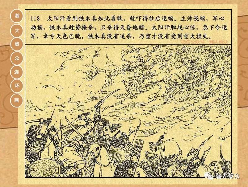 118太阳汗看到铁木真如此勇敢,就吓得往后退缩。主帅畏缩,军心动摇,铁木真趁势掩杀,只杀得天昏地暗。太阳汗胆战心惊,急下令退军,幸亏天色已晚,铁木真没有追杀,乃蛮才没有受到重损失。