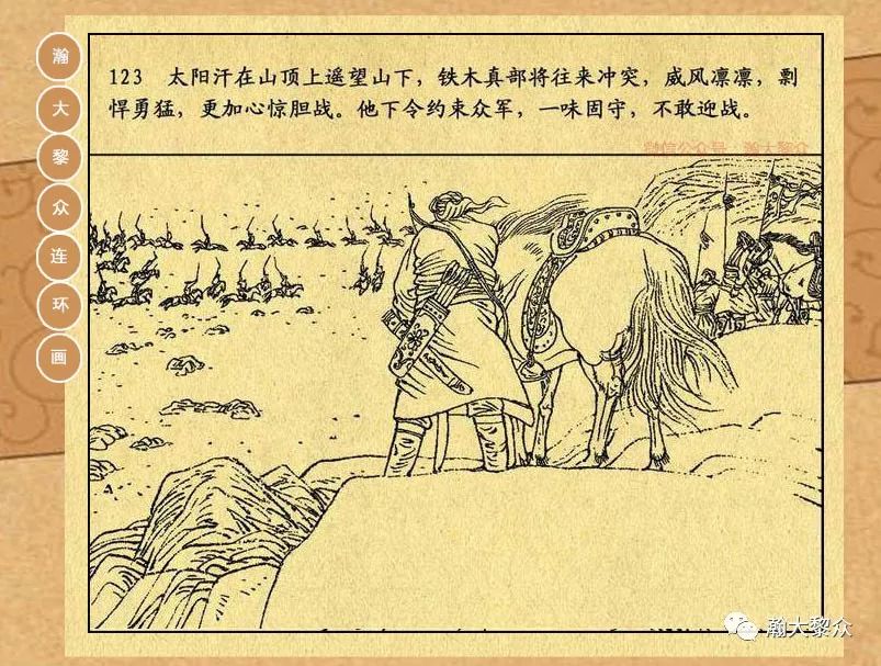 123太阳汗在山顶上遥望山下,铁木真部将往来冲突,威风凛凛,剽悍勇猛,更加心惊胆战。他下令约束众军,一味固守,不敢迎战。