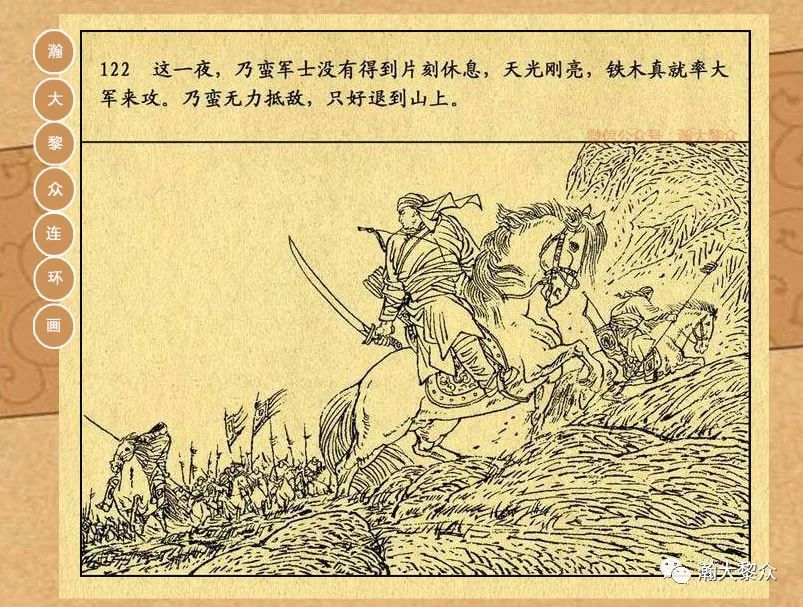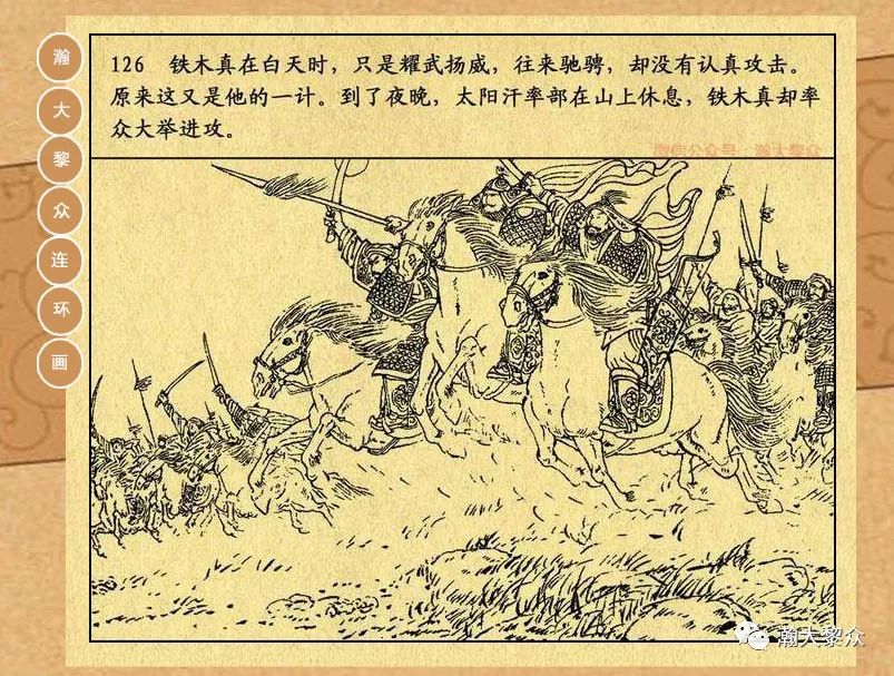 126铁木真在白天时,只是耀武扬威,往来驰骋,却没有认真攻击。原来这又是他的一计。到了夜晚,太阳汗率部在山上休息,铁木真却率众举进攻。