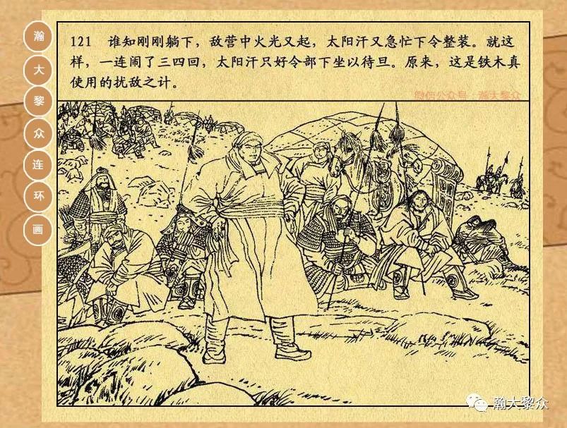 121谁知刚刚躺下,敌营中火光又起,太阳汗又急忙下令整装。就这样,一连闹了三四回,太阳汗只好令部下坐以待旦。原来,这是铁木真使用的扰敌之计。