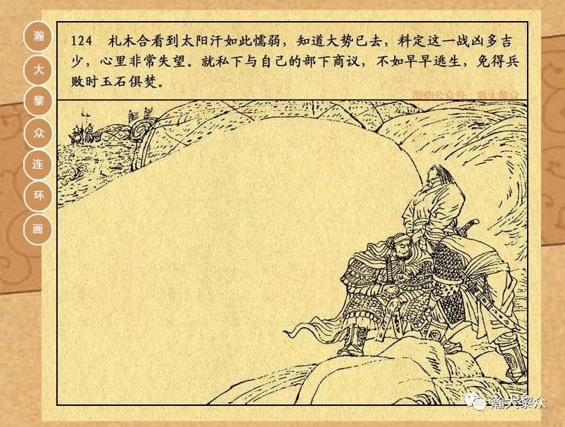 124礼木合看到太阳开如此忧弱,如道势已去,料定这一战凶多吉少,心里非常失望。就私下与自己的部下商议,不如早早逃生,免得兵败时玉石俱焚。