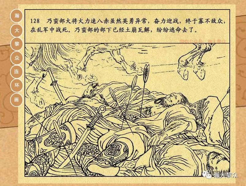 128乃蛮部将火力速八赤虽然英勇异常,奋力迎战,终于寡不敌众,在乱军中战死。乃蛮部的部下已经土崩瓦解,纷纷逃命去了。