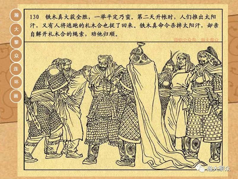 130铁木真大获全胜,一举平定乃蛮。第二天升帐时,人们推出太阳汗,又有人将逃跑的札木合也捉了回来。铁木真命令杀掉太阳汗,却亲自解开札木合的绳索,劝他归顺。