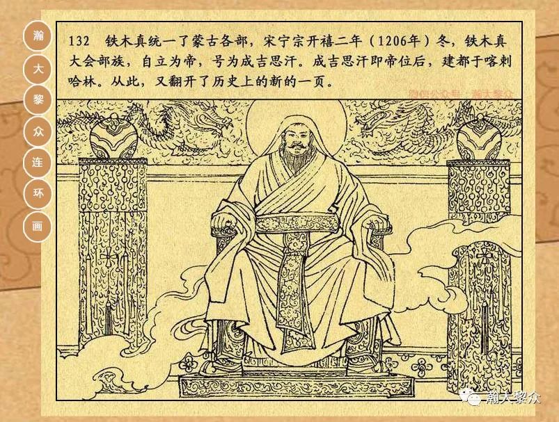 132铁木真统一了蒙古各部,宋宁宗开精二年(1206年)冬,铁木真大会部族,自立为帝,号为成吉思汗。成吉思汗即帝位后,建都于喀剌哈林。从此,又翻开了历史上的新的一页。