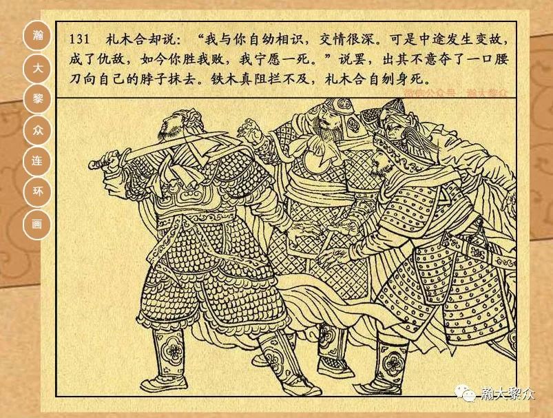 131札木合却说:“我与你自幼相识,交情很深。可是中途发生变故,成了仇敌,如今你胜我败,我宁愿一死。”说罢,出其不意夺了一口腰刀向自己的脖子抹去。铁木真阻拦不及,札木合自刎身死。