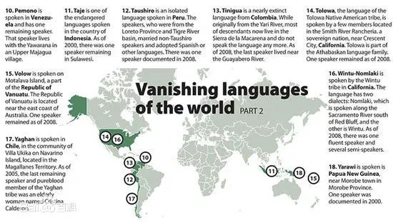 据《基督教科学箴言报》报道,联合国教科文组织日前发布一个最新的“全球濒危语言地图”,该地图指出全球有199种语言处境告急,其中有18种语言被列为“极度濒危语言”。