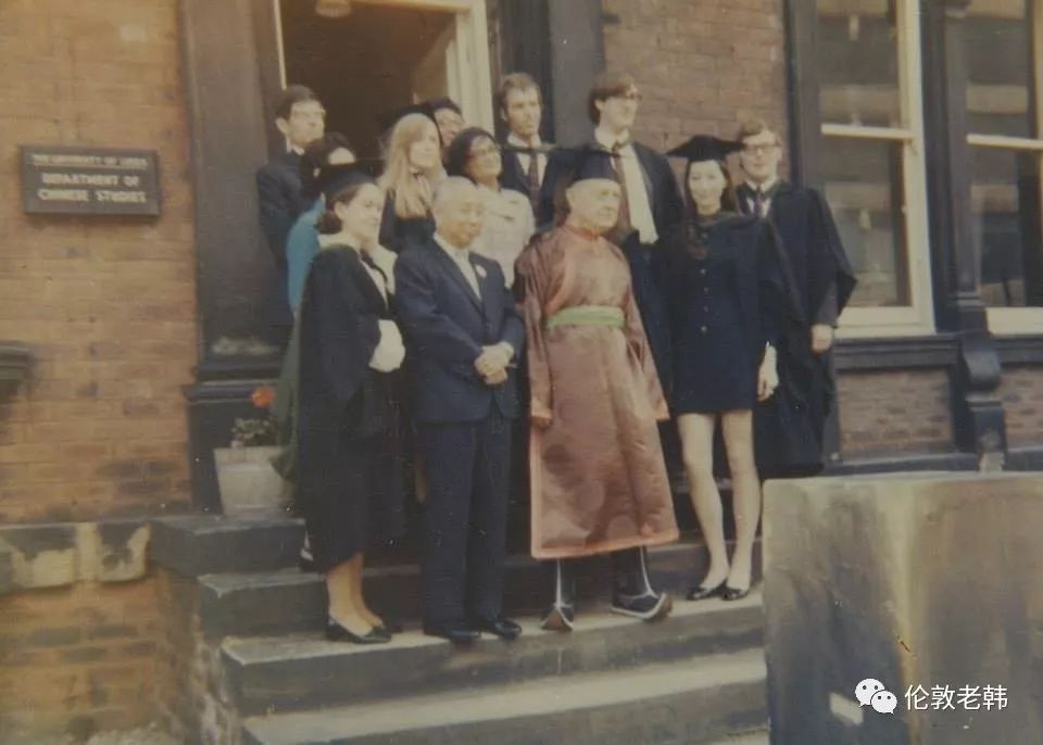 五十年代美国麦卡锡主义令拉铁摩尔移居英国。他在英国利兹大学建立了那里的蒙古中国研究中心。图为受拉铁摩尔指导学生同穿蒙古袍的拉铁摩尔在1970年合影