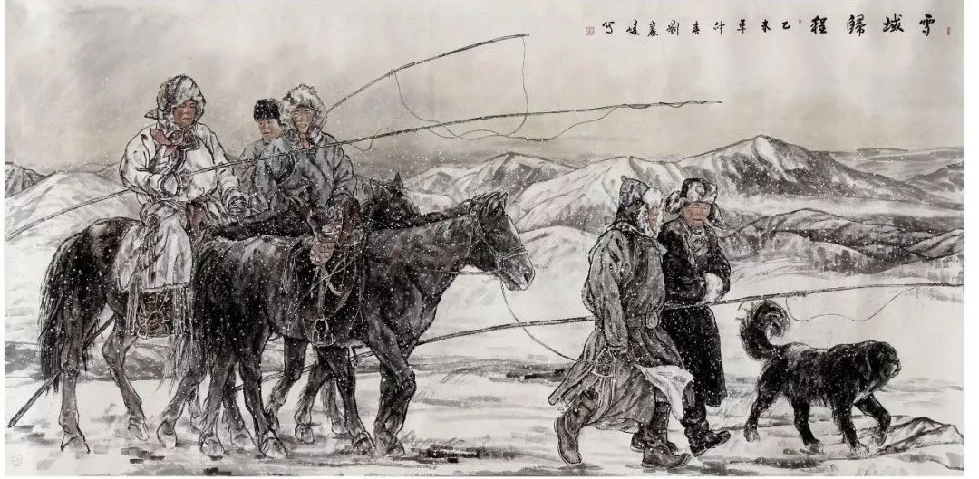 最初的创作只是一种尝试。数年后,我才开始了真正意义上的草原民族风情题材创作。在桑建国、鲍凤林、张树昌几位导师的精心指导下,我在素材搜集整理、设计构图、绘画技法等几个重要创作要素方面的基本功均有了一定的提高。直至2015年5月,我创作完成了第一幅入选“国展”的作品——《冬日》。