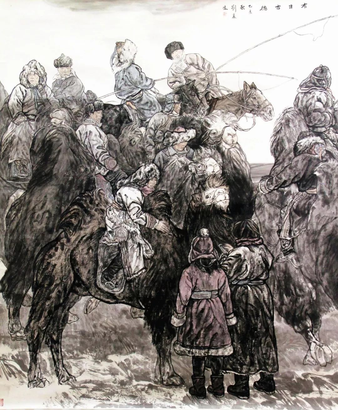 在我随后的草原风情人物画的创作中,《欢迎你到草原来》是一件重要作品。这是一幅长、宽均超过两米的大画,画面人物众多且形象特征明显,创作素材源于我在2014年夏季一次深入草原的经历。那次采风我去了内蒙古白音勿拉的牧人苏亚拉家。这是一户质朴、热情、奔放的草原人家。画面表现的是采风团刚到时一家人对我们热情迎接的场面。85岁的老额吉带着儿子苏亚拉和众家人为我们献上洁白的哈达,并为我们敬上蒙古族崇高的迎候礼——下马酒,蒙古族妇女和少年为我们演唱了悠扬的长调……可以说,画面中所描绘的每一个人物都在当时给予我深深的触动。现场我为老额吉和几位家人画像,又画了数张场景速写。当晚,我们住在苏亚拉家的蒙古包。美酒、歌声、舞蹈,让采风团的每一位成员都流连忘返,久久不能释怀。回到工作室,我马上将搜集来的资料连同我现场的写生进行组合构思。几经修改,作品终于完成。此作品运用中国画写意的笔墨来表现蒙古族同胞的热情豪迈。我夸大了人物的动势,精细地刻画出人物的心理活动和由此引申出来的面部表情与肢体语言。背景用简洁的远山和大面积的留白来突出主体人物形态,使画面更加深入人心。此画入选了中国美协主办的第三届“吉祥草原·丹青鹿城”——全国中国画作品展。
