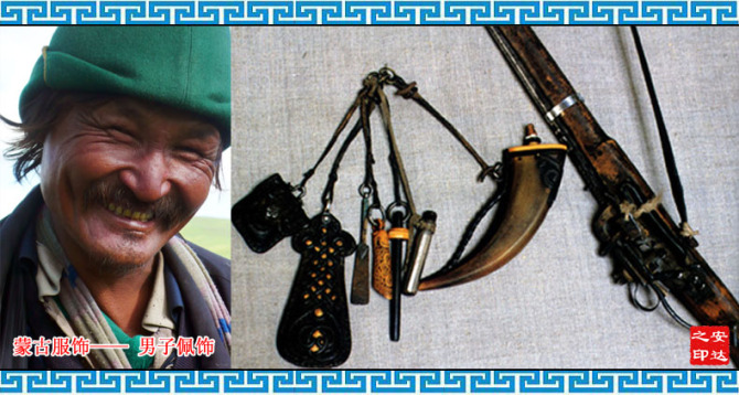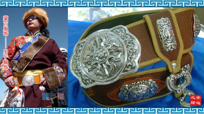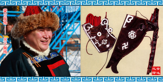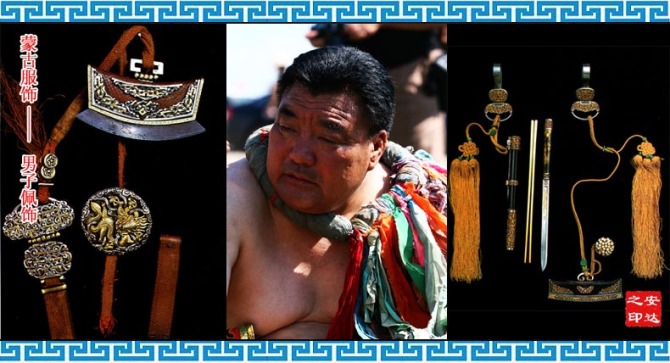 蒙古刀种类繁多,造型各异,大小不一。主要用来杀羊吃肉,也是男子汉的佩饰。不戴蒙古刀的男子汉,妇女们多看不起。但蒙古刀并不是械斗的工具,我在牧区十八年,没有见过一个打架动刀子的,有些传闻全系外人的误解。蒙古银匠最拿手的技术就是做刀。刃用好钢,柄用牛角、红木做成。从前的蒙古刀比现在复杂、实用而漂亮,鞘中有孔,可插象牙或驼骨筷子。鞘上有环,环上缀有丝线带子。丝线带子一头有环,可以挂在胯上,一头编有蝴蝶结,下面是穗子;一头有勃勒。勃勒是一种银子打的圆形饰件,上面有花纹,中间嵌有珊瑚大珠。这个物件以后还要多次出现,请读者记住这个蒙语名称。蒙古刀的勃勒,也有用绸缎刺绣的。刀鞘用金、银、铜做成,上刻龙、虎、兽头、云纹图案,象牙筷的大头一端还套有银束子。民间传说饭菜下毒用它可以试出来,不知真假。