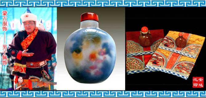鼻烟壶人们并不生疏,造型多系扁圆、留肩、底大、颈小的矮扁瓶儿。鄂尔多斯男女老少每人都有,实在没有的临时找个玻璃小瓶也要代替,因为它是行礼的必备之物。因此这玩意儿在牧区很发达,有玛瑙、玻璃、水晶、银、玉、石、磁、木头多种,有内绘花和外刻花的两种工艺。高级的鼻烟壶盖子是银子的,上面镶嵌一块珊瑚或松石大圆珠,盖上自带一个挖耳勺大小的东西,可以伸进鼻烟壶颈郡的细孔里,从里面挖出鼻烟。据说鼻烟用六种东西组成。用那个小勺挖出一点放在指甲上,凑到鼻孔上一吸,立马能打出喷嚏来。不过,蒙古人见面交换鼻烟壶,并不是让对方吸自己的鼻烟。一般是与献哈达同时进行的。两人见面以后,各掏出自己的哈达和鼻烟壶,将哈达的口儿(指折叠出两片的那面)朝对方,架在自己的手腕上,右手拿着鼻烟壶。把哈达搭在对方的手腕上,用右手把鼻烟壶递过去。对方用左手把鼻烟壶接住,各放于右手上,在手心里旋转一圈以后,又递在对方的左手里,哈达再搭到对方的手腕上,这样各自又把自己的鼻烟壶和哈达换了回来,并不是真正的交换。有的人家鼻烟壶用了好几代,价值三四匹马,哪能与你的玻璃瓶交换?传说从前蒙古人见面以后,各取小石一块相对互击一下,后来君主可汗把它改造成鼻烟壶。