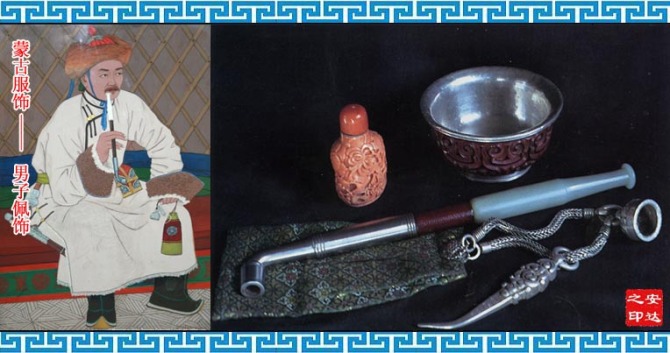 牧区过去普遍抽旱烟(烟叶),烟袋很讲究,大体由烟锅(烟袋头)、木杆和嘴子三部分构成。烟锅是装旱烟的部分,用铜、银制作,颇有雕饰。木杆用红术和鼠李木制作,有天然或油漆花纹,中有细孔,可以通过烟嘴把烟锅燃着的烟气吸到嘴里。这三件东西在一起组装的时候,接口处要加镂花錾花的银束子。木杆有一二尺长,烟嘴用玉石、翡翠做成,忌妇人吸食,说是会落颜色。询诸多人,都答是真的,不知何故。