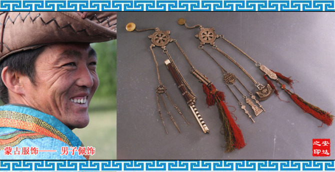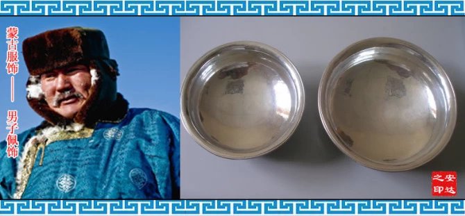 针插子是放针线的,鼻烟壶袋是放鼻烟壶的。蒙古女子去别人家或野外遇见人,要交换鼻烟壶表示问候。它们都有纯银打造和手工制作的两种。一般这两件通过两或四条链儿连在一起,再用一个银勃勒挂在前襟上。银子打造的用錾花镂空工艺,图案花样繁多。手工刺绣多是妇女根据本人喜好选择的图样。无论哪一种,下面都要吊丝线、珊瑚穗子或银铃儿。