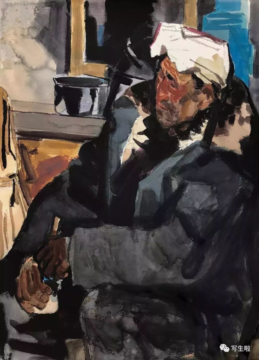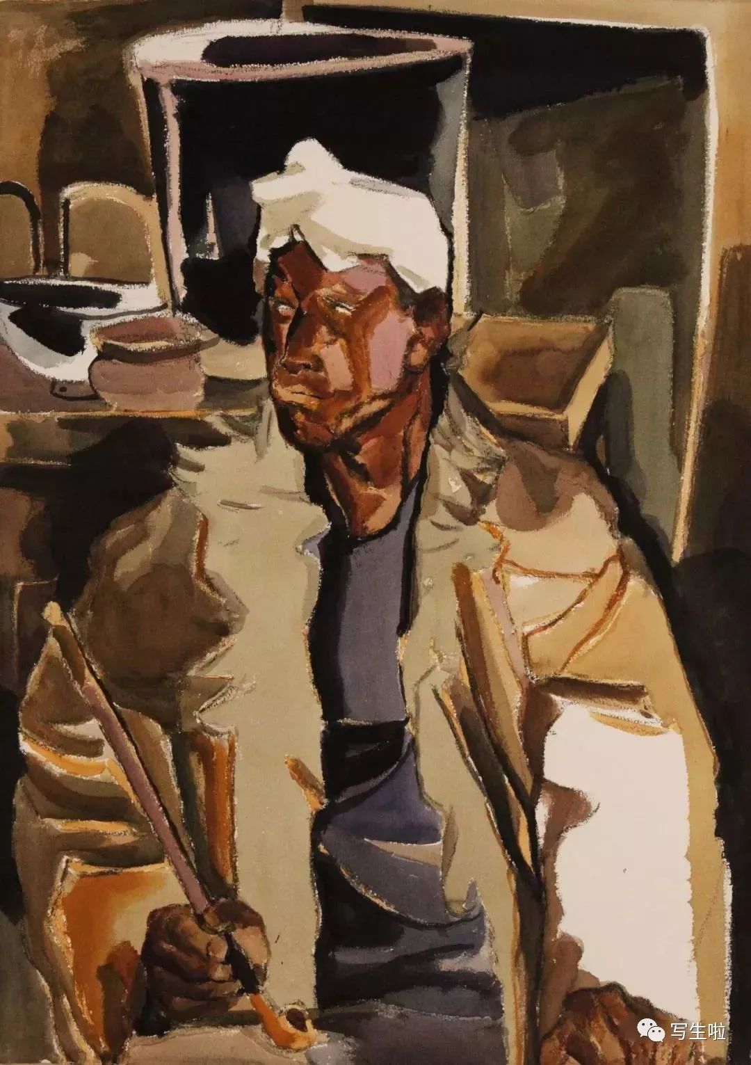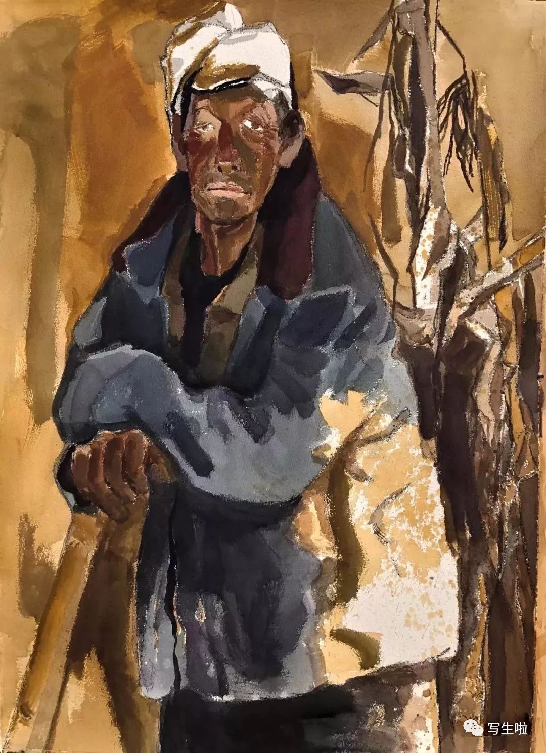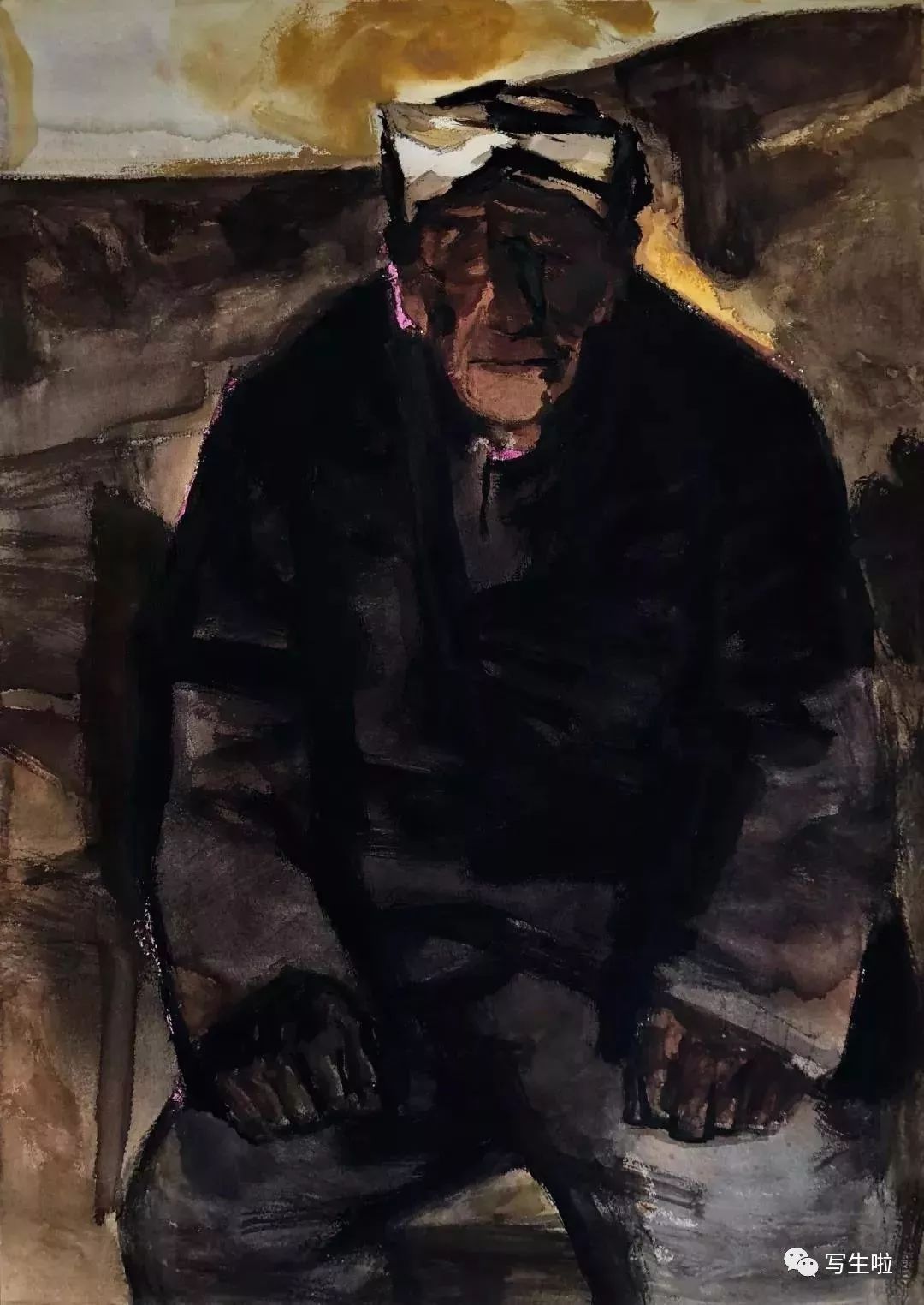 《坐在窑洞里的陕北农民》/ 纸本水彩 / 105x75cm / 2018