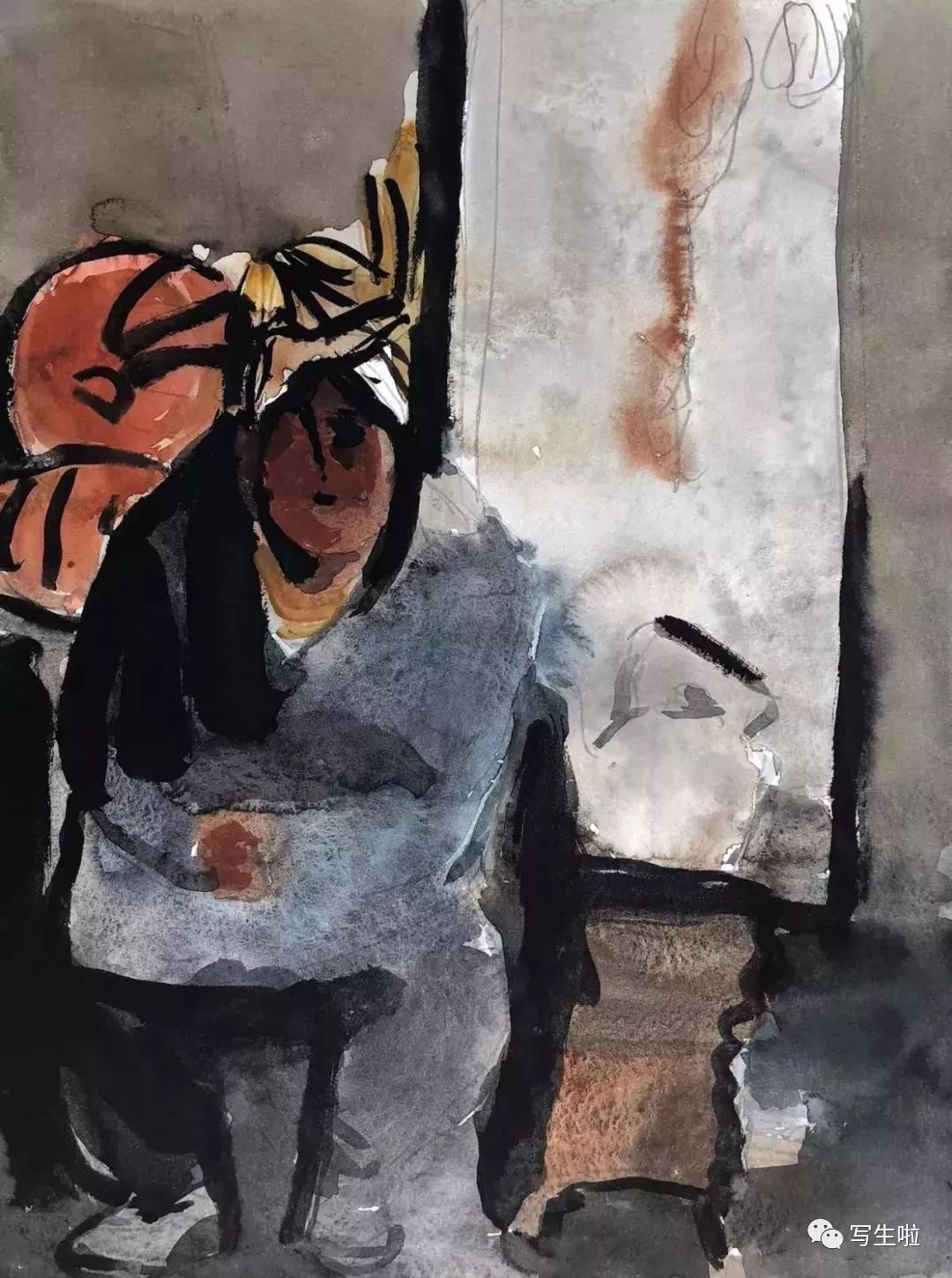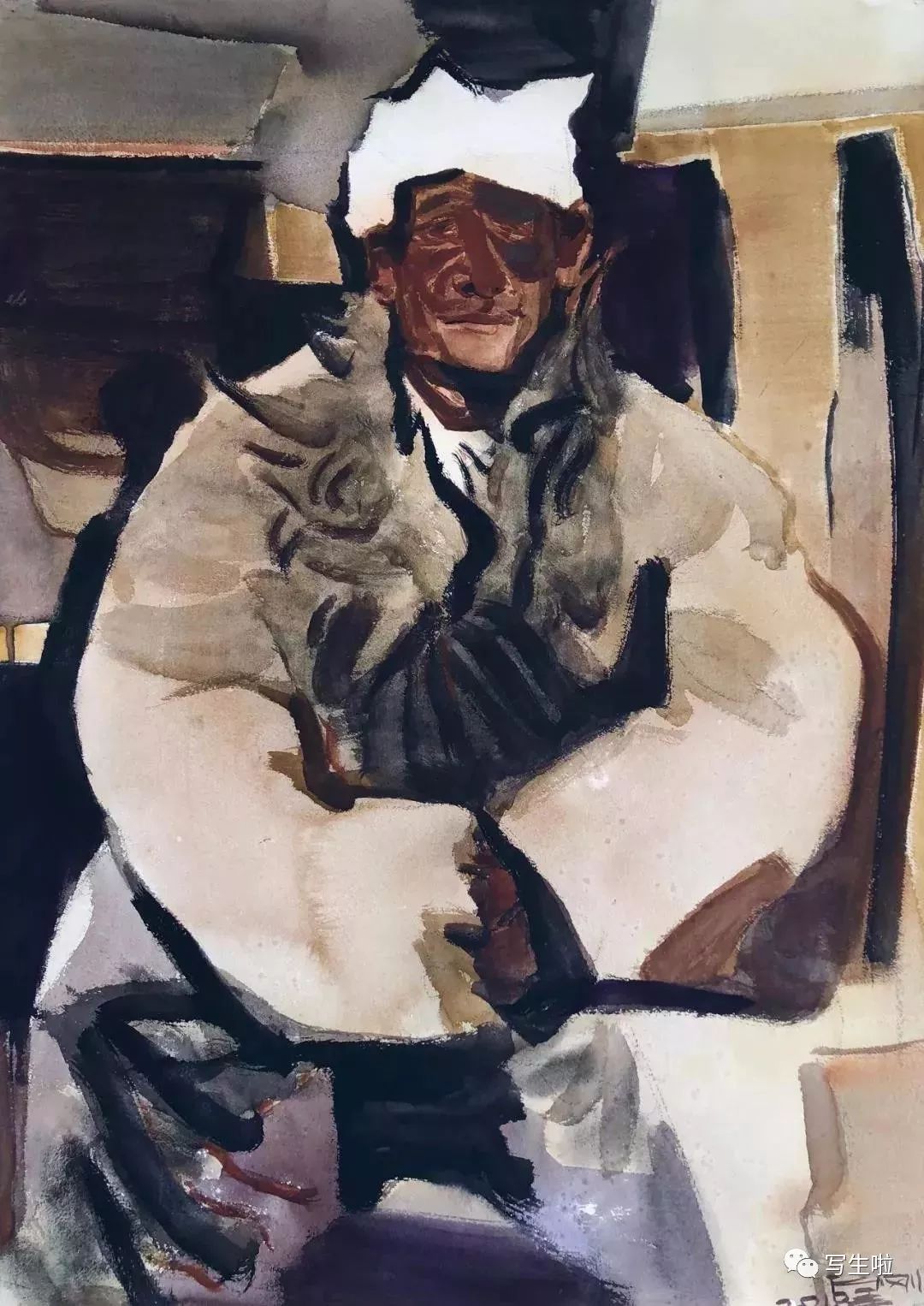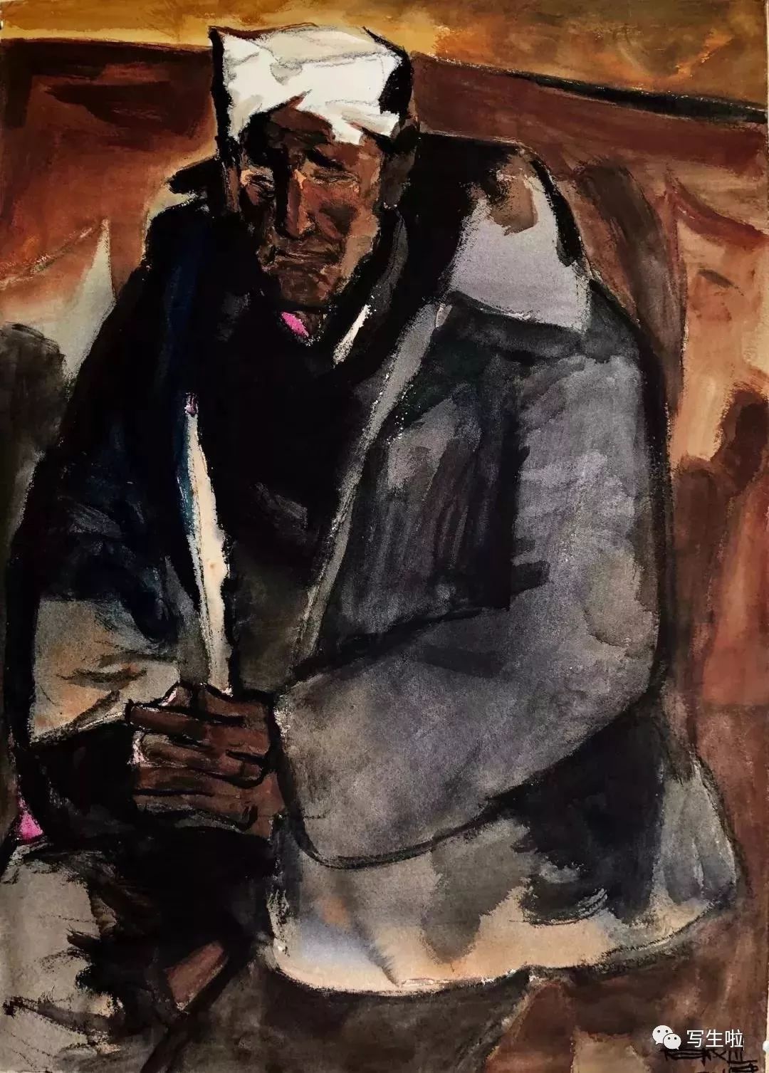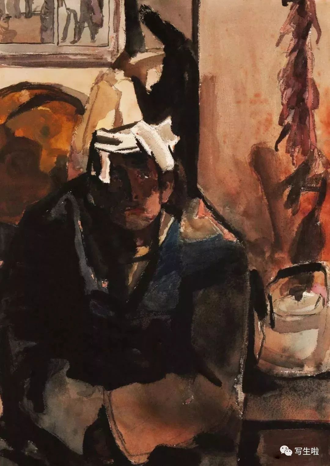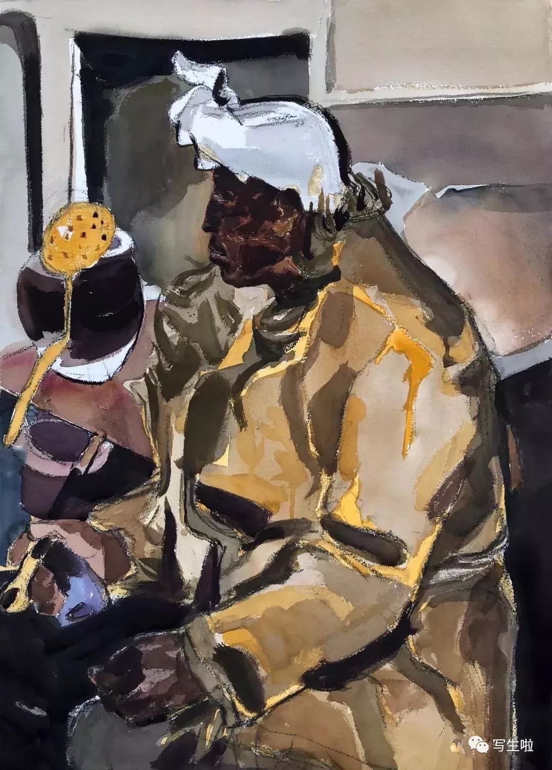 《坐在窑洞里的陕北农民》/ 纸本水彩 / 105x75cm / 2018