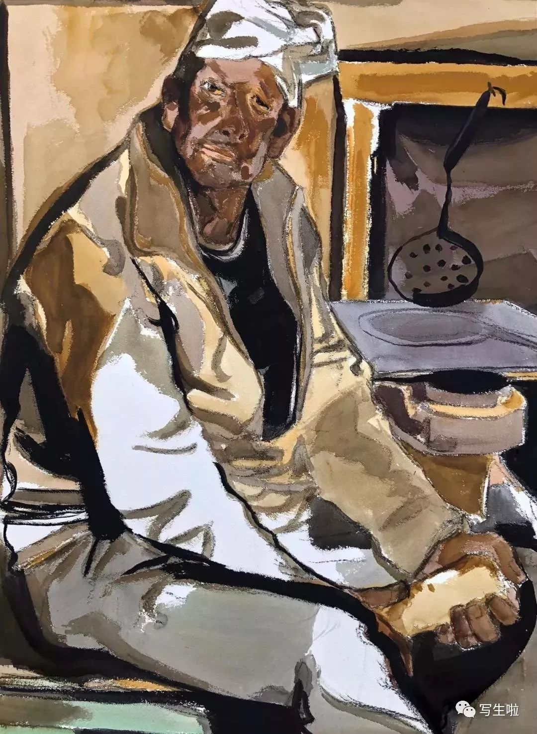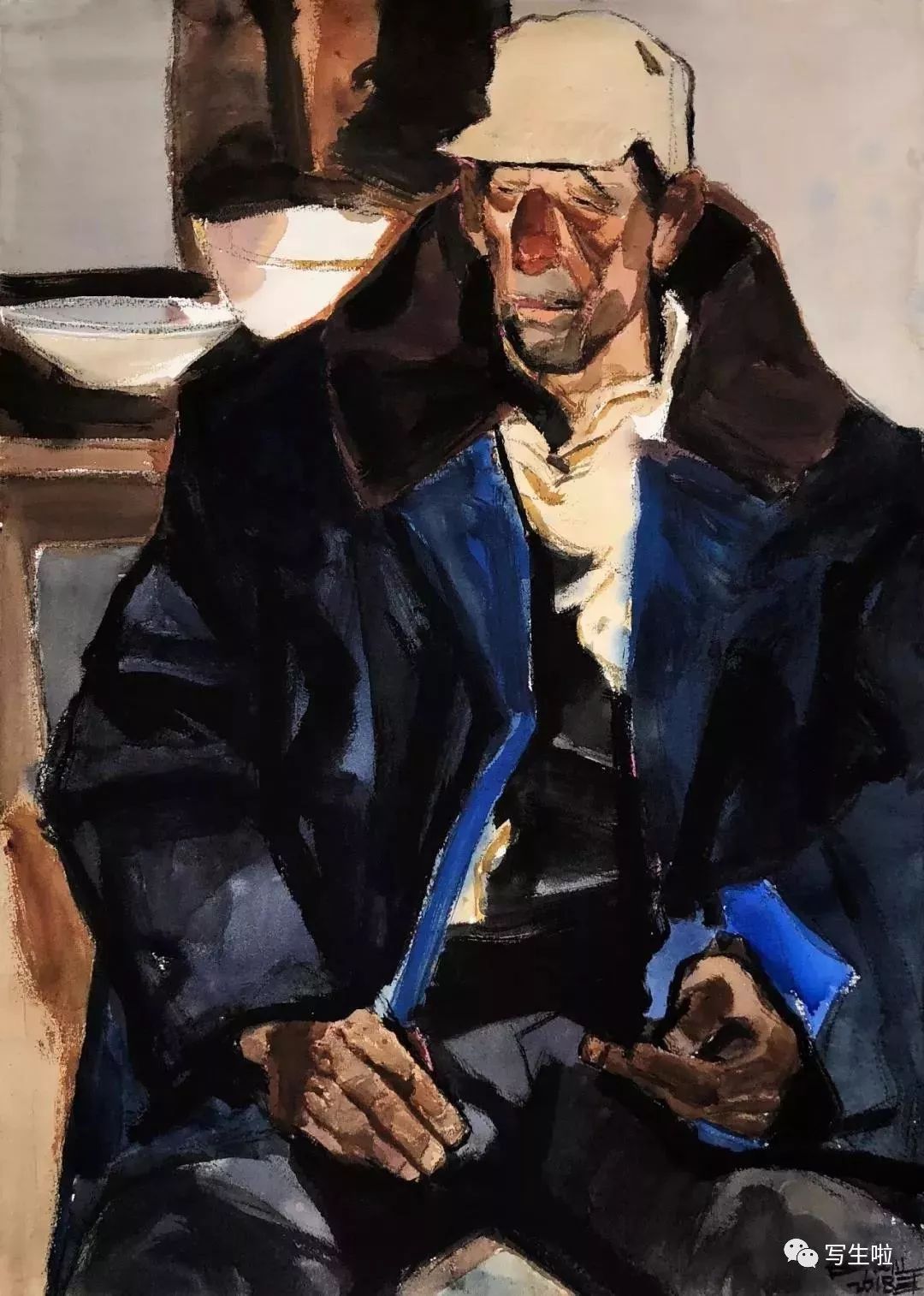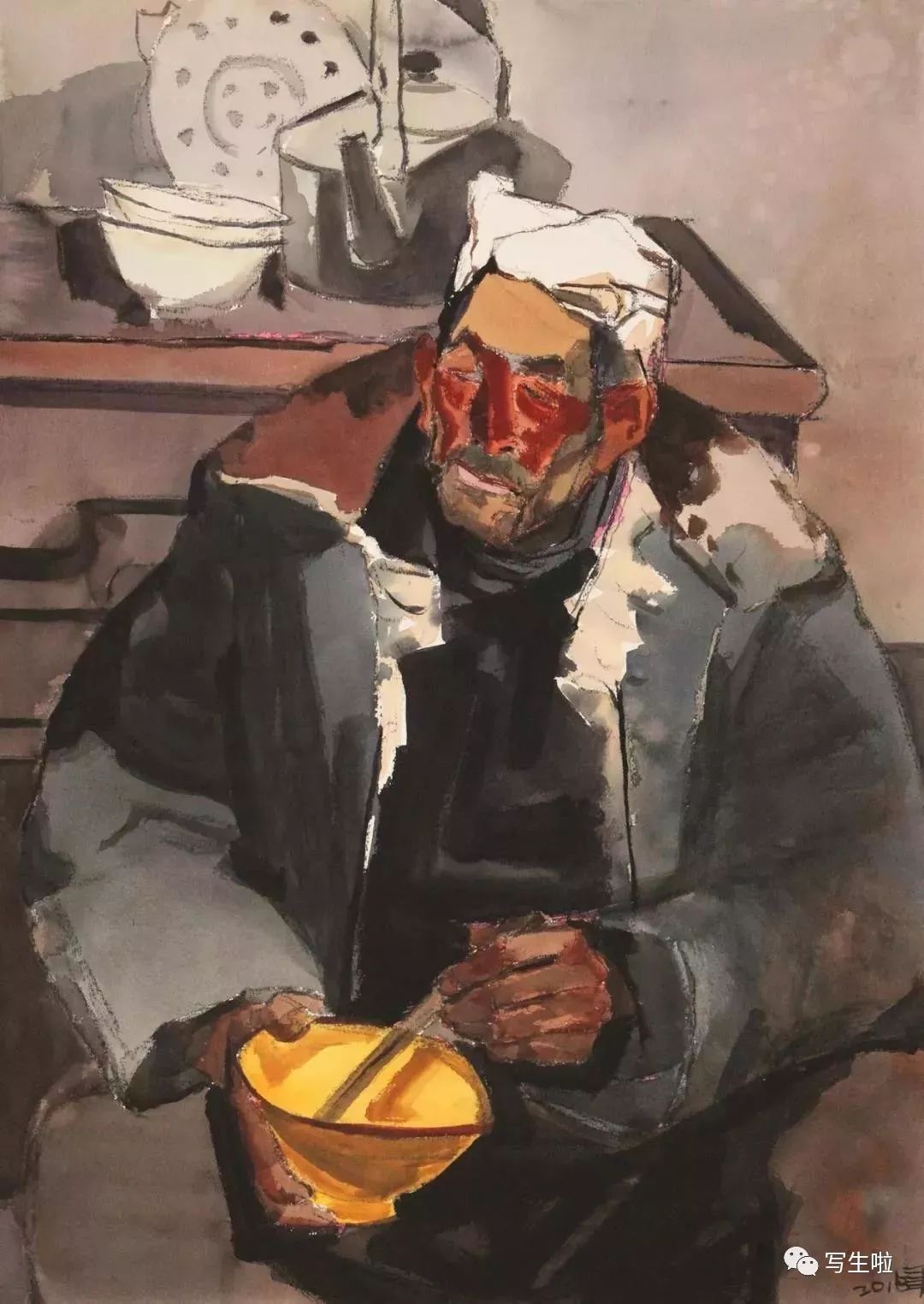 《手拿饭碗的郭老汉》/ 纸本水彩 / 105x75cm / 2018