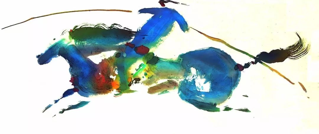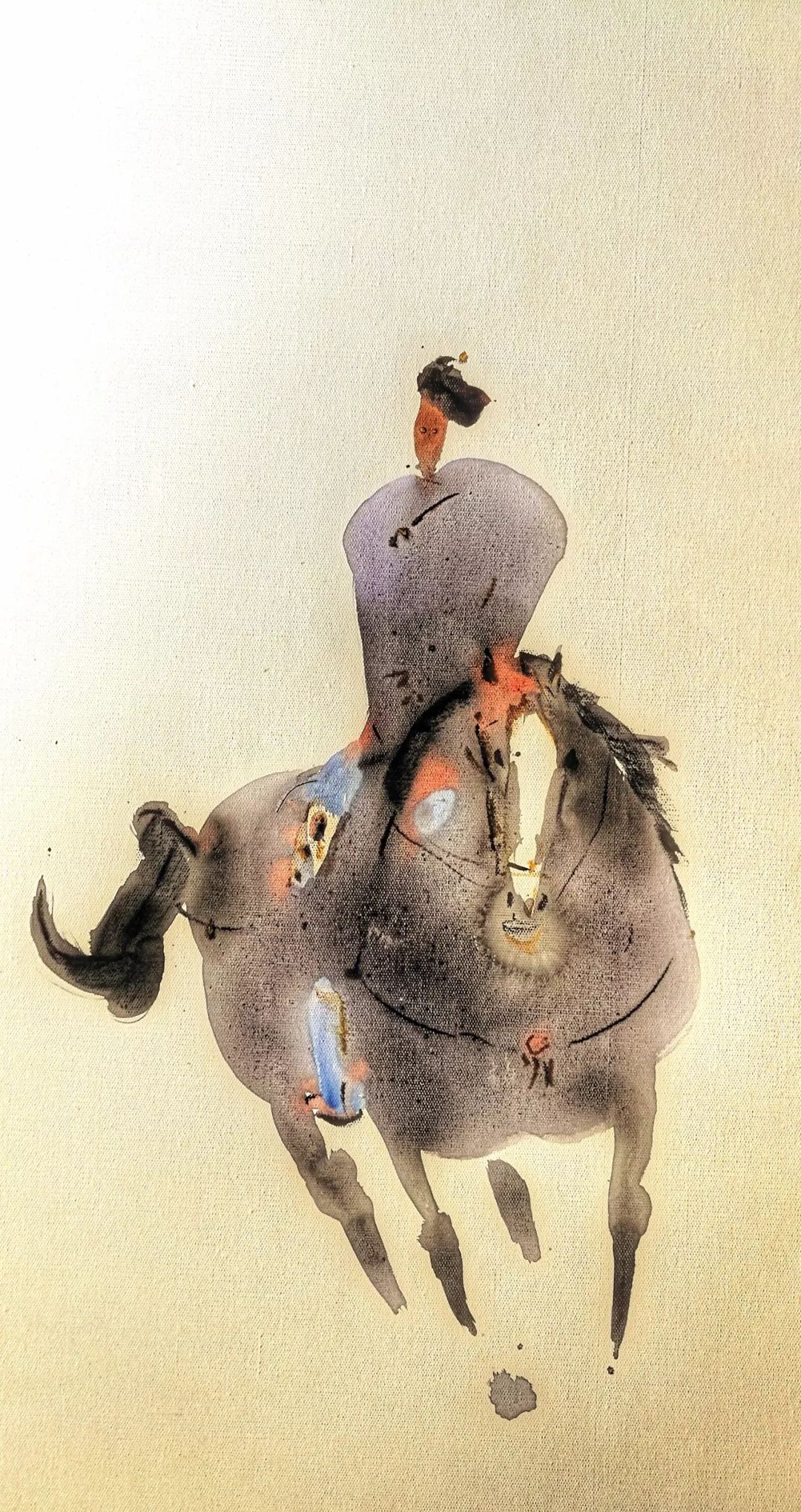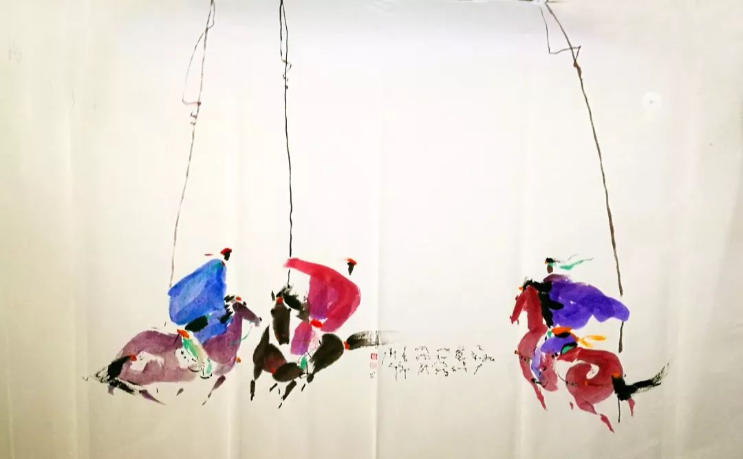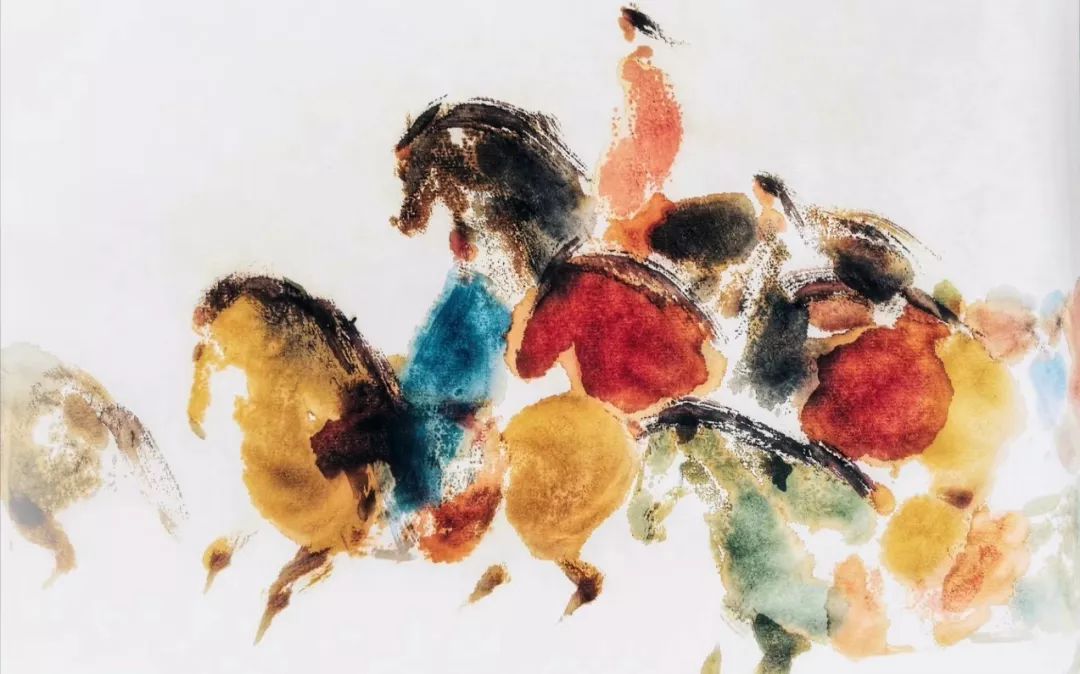 中国画的写意方法表现自由,不太受形的限制。他笔下的马或奔腾或安详,静动结合,动态和结构很好的表现了蒙古马的特征,尤其是他将油画色彩因素也融入到画马之中,使作品也有别样的韵味,形未尽、意已足。他的作品给观者也留下了很大的想象空间。犹如天马行空。