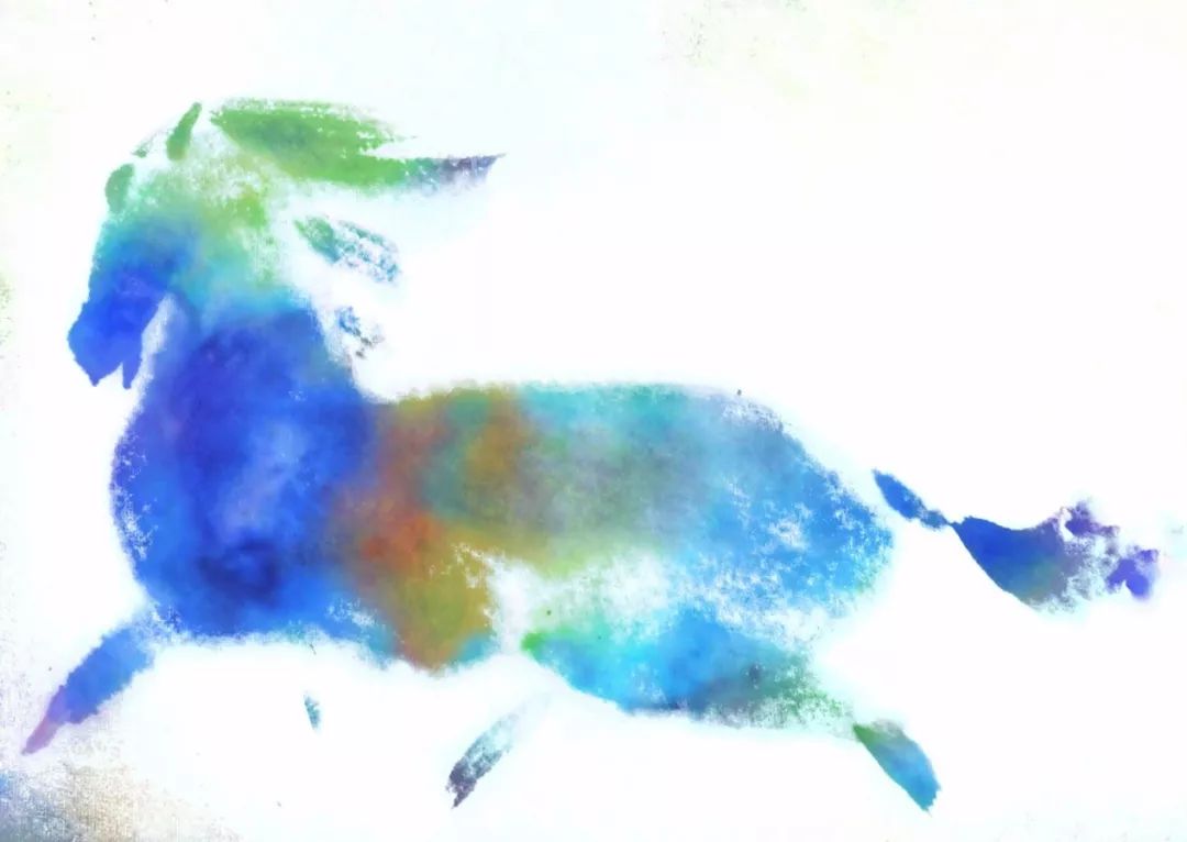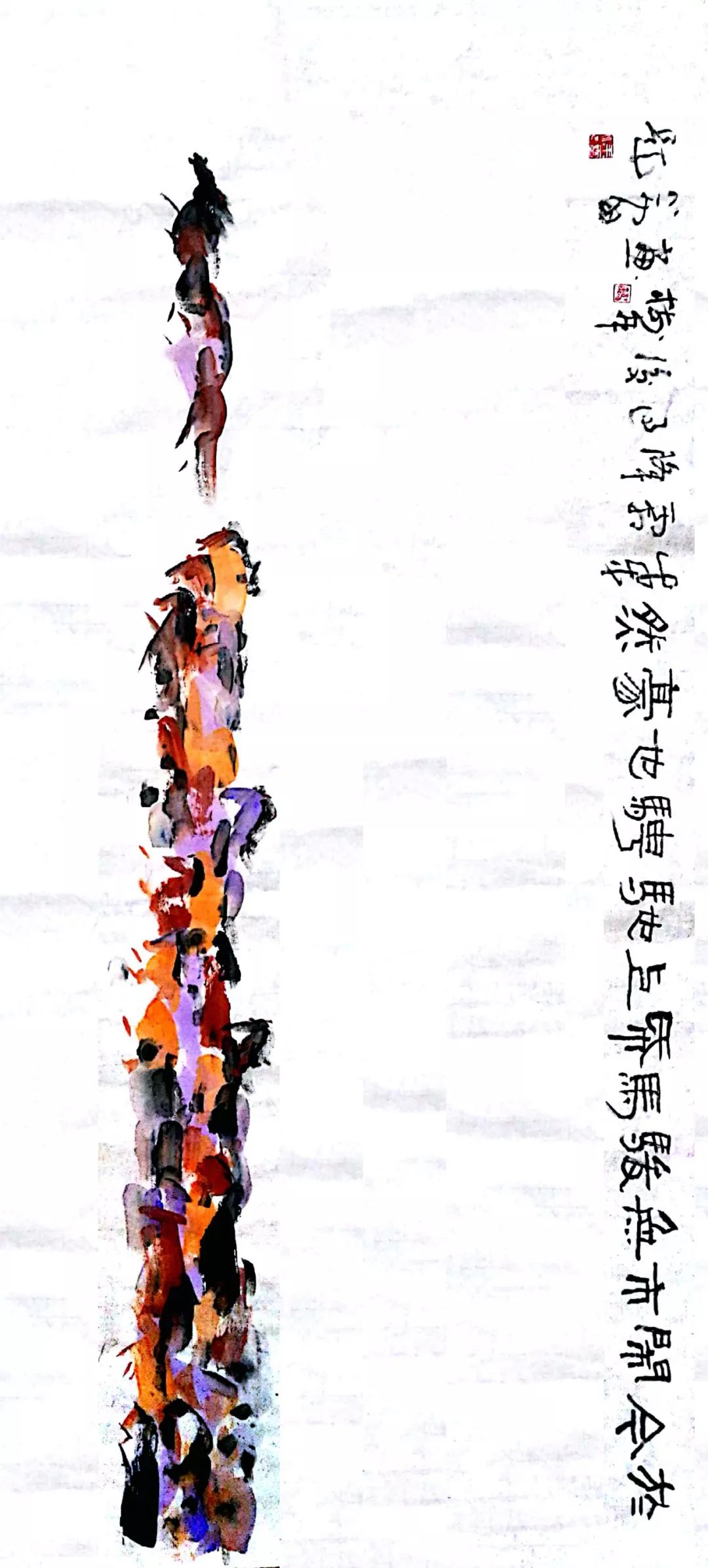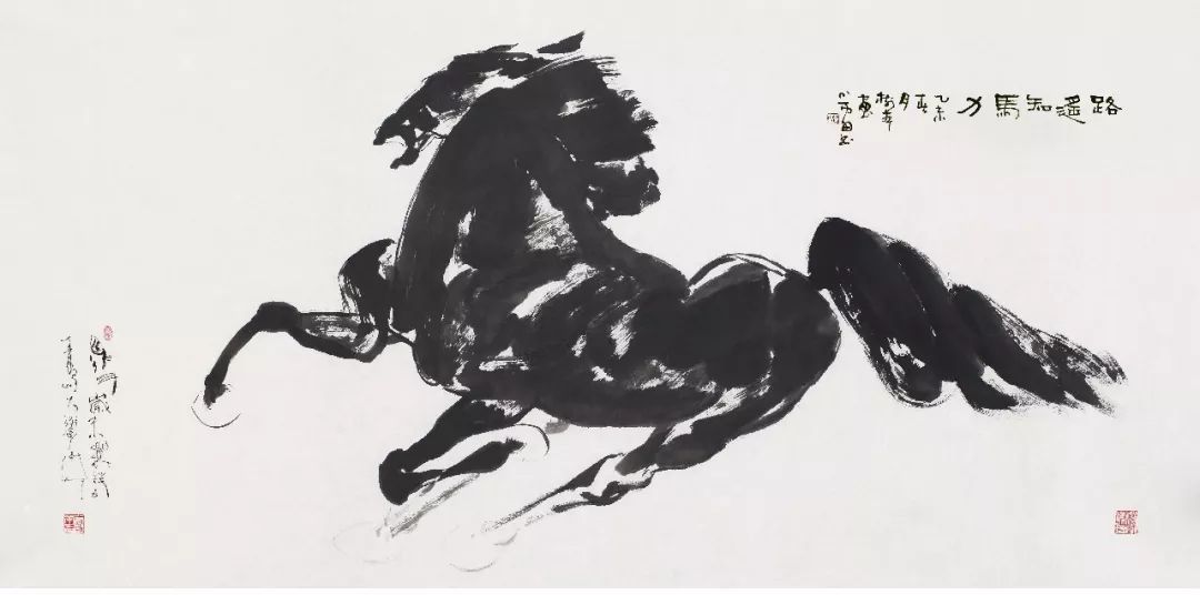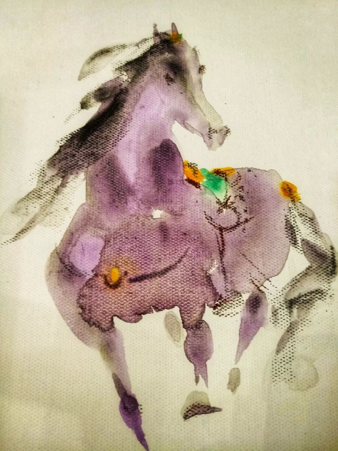 中国画的写意方法表现自由,不太受形的限制。他笔下的马或奔腾或安详,静动结合,动态和结构很好的表现了蒙古马的特征,尤其是他将油画色彩因素也融入到画马之中,使作品也有别样的韵味,形未尽、意已足。他的作品给观者也留下了很大的想象空间。犹如天马行空。